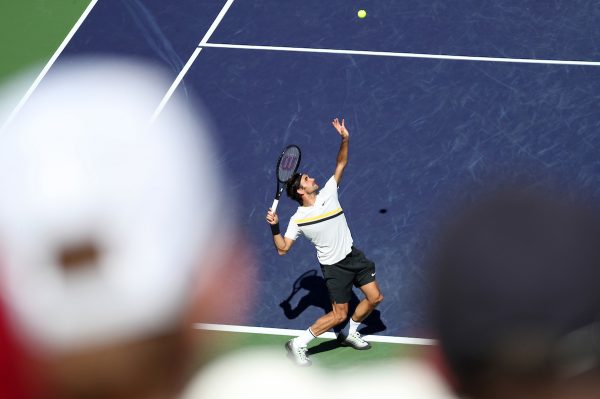 Saturday, March 17, 2018 – Roger Federer reacts to his win over Borna Coric in the Semifinal of the BNP Paribas Open in Stadium 1 at the Indian Wells Tennis Garden in Indian Wells, California. (Matthew Thomas/BNP Paribas Open)