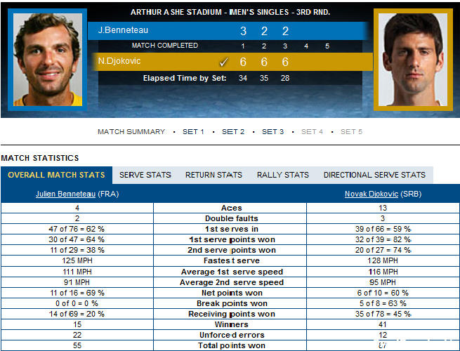 در مرحله سوم مسابقات آزاد آمریکا دوتنیسورخوب در مقابل هم قرار گرفتند,نواک جوکوویچ صرب و جولین بنتو فرانسوی.در این مسابقه تنیسور فرانسوی که در رتبه ۳۵ رنکینگ جهانی قرار دارد بازی متوسطی به نمایش گذاشت ولی جوکویچ مثله همیشه با تکنیک و قدرت تنیسهای خود توانست این مسابقه را بسود خود تمام کند.جوکویچ این بازی را در سه ست و با نتایج ۶-۳ و ۶-۲ و ۶-۲ به پایان برد و به مرحله چهارم مسابقات رسید.