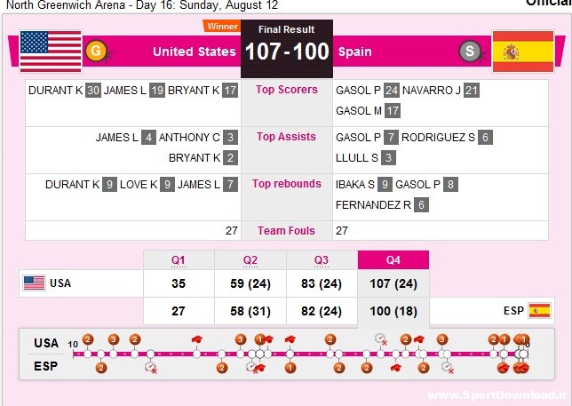 در جریان این دیدار، تیم ملی آمریکا در کوارتر اول با نتیجه ۳۵ بر ۲۷ به پیروزی رسید اما کوارتر دوم را با نتیجه ۲۴ بر ۳۱ واگذار کرد. نتیجه دیدار دو تیم آمریکا و اسپانیا در کوارتر سوم به تساوی ۲۴ بر ۲۴ انجامید اما آمریکا با پیروزی ۲۴ بر ۱۸ که در کوارتر چهارم بدست آورد، برنده نهایی این بازی شد. به کاربران محترم اسپرت دانلود پیشنهاد می کنم این فینال فوق العاده دیدنی رو از دست ندید.