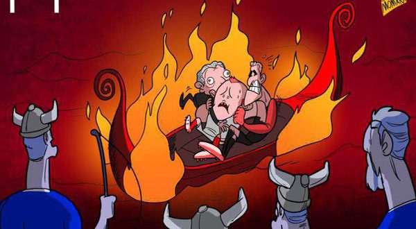 «عمر مومانی» در کارتون جدید خود سرمربی تیم ملی انگلستان را به تصویر کشیده که به همراه «جو هارت» و «وین رونی» در قایقی که به دست وایکینگ ها آتش گرفته، غرق میشوند.
